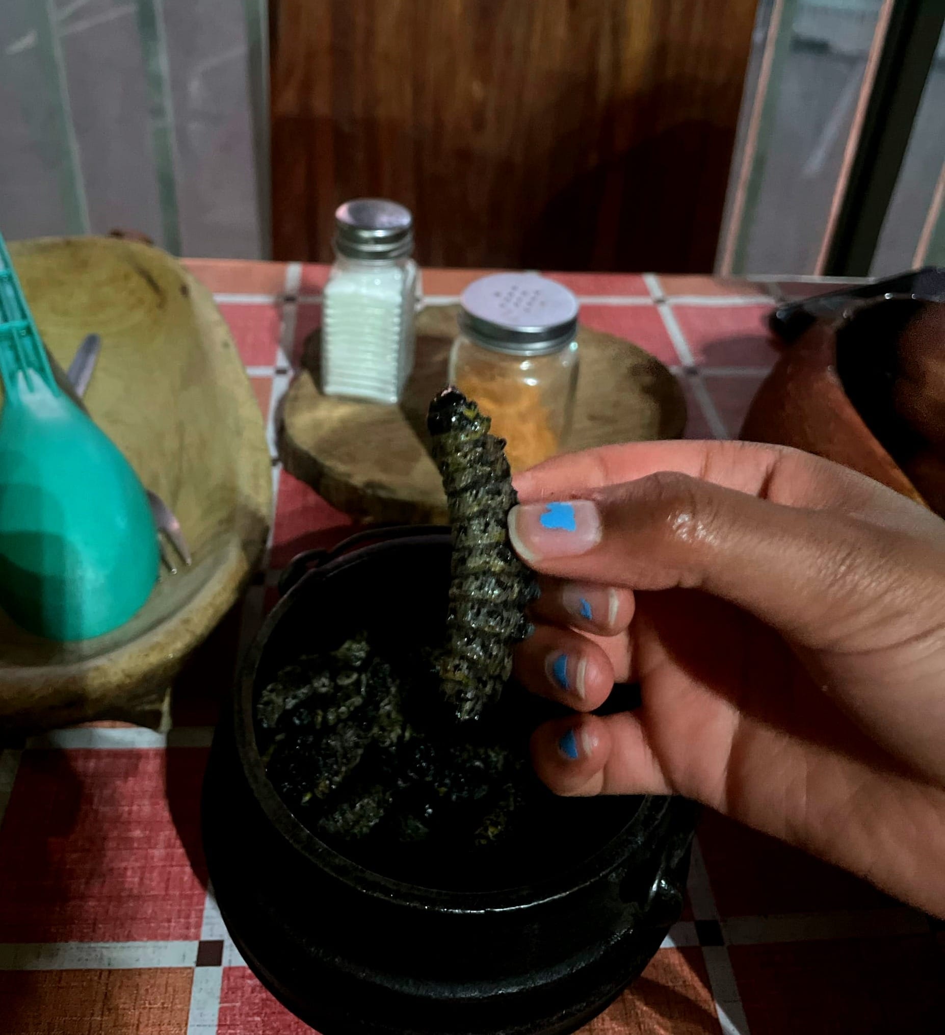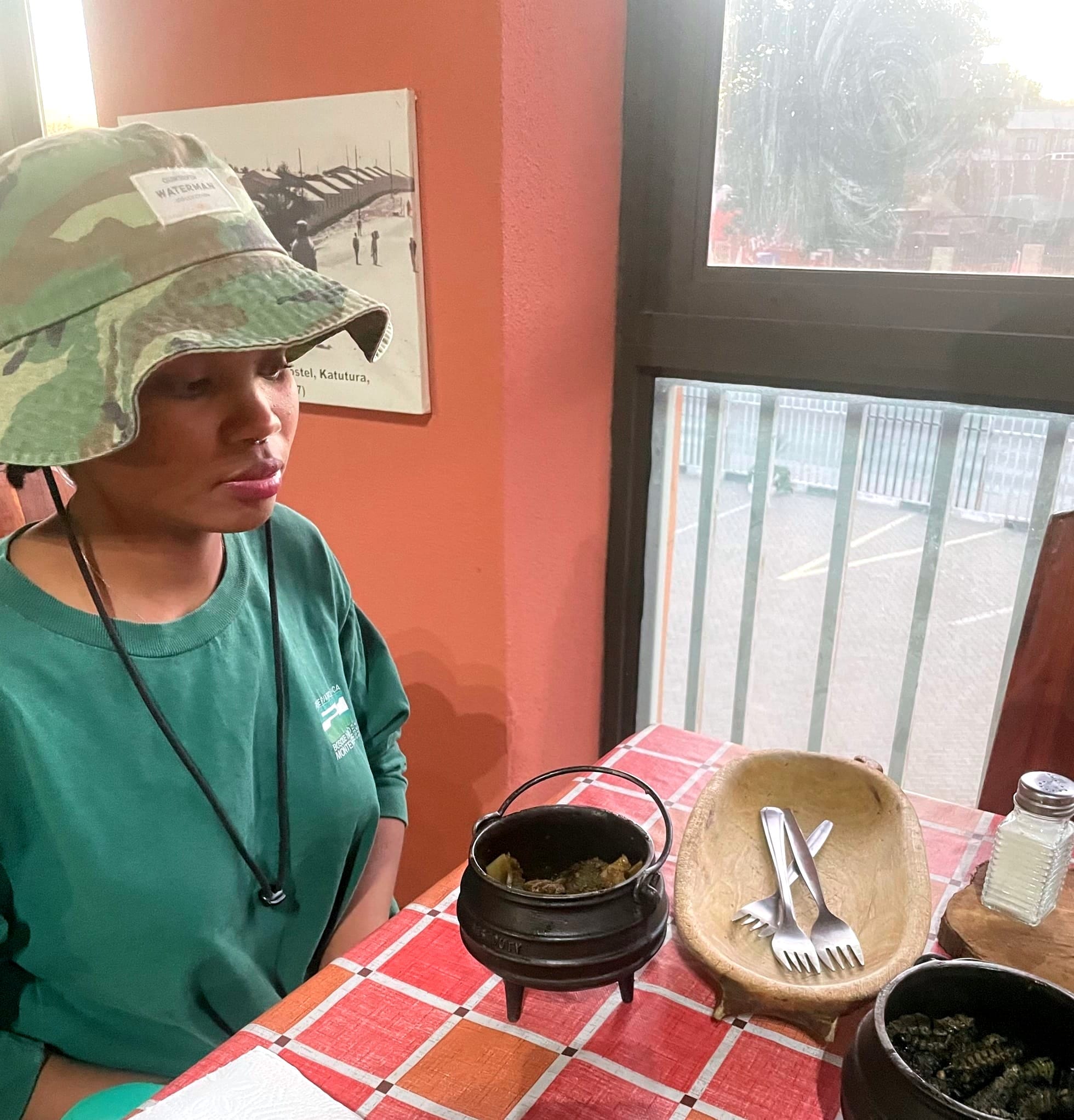 The restaurant was its own double-storey unit, inspired by traditional oshiwambo housing. It had a grass roof, much like a hut, and the furniture was mostly wood. We noticed traditional oshiwambo patterns, and especially pottery inside the restaurant. The pottery being a proud representation of way of life of the Aawambo people, bowls in different shapes and sizes for multiple uses such as carrying water, storing and serving food amongst others.